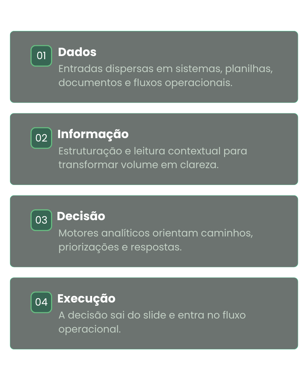 A JustIA transforma dados brutos em informação, informação em decisão e decisão em execução. Menos ruído, mais clareza, mais capacidade real de agir